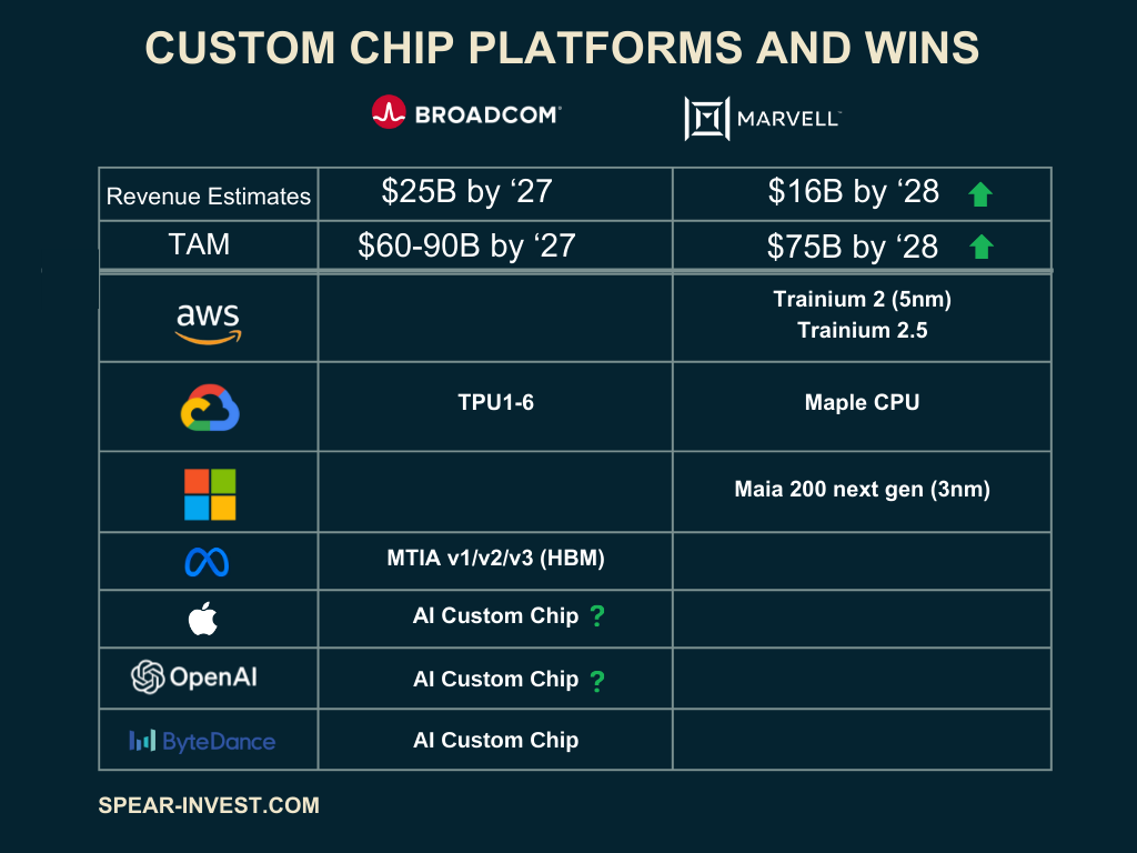 两间公司都拥有强大的平台,Marvell的最大客户是亚马逊和微软,而博通的最大客户是谷歌、Meta(NASDAQ:META)和字节跳动。那么,这些公司各自在哪些领域有望胜出呢?