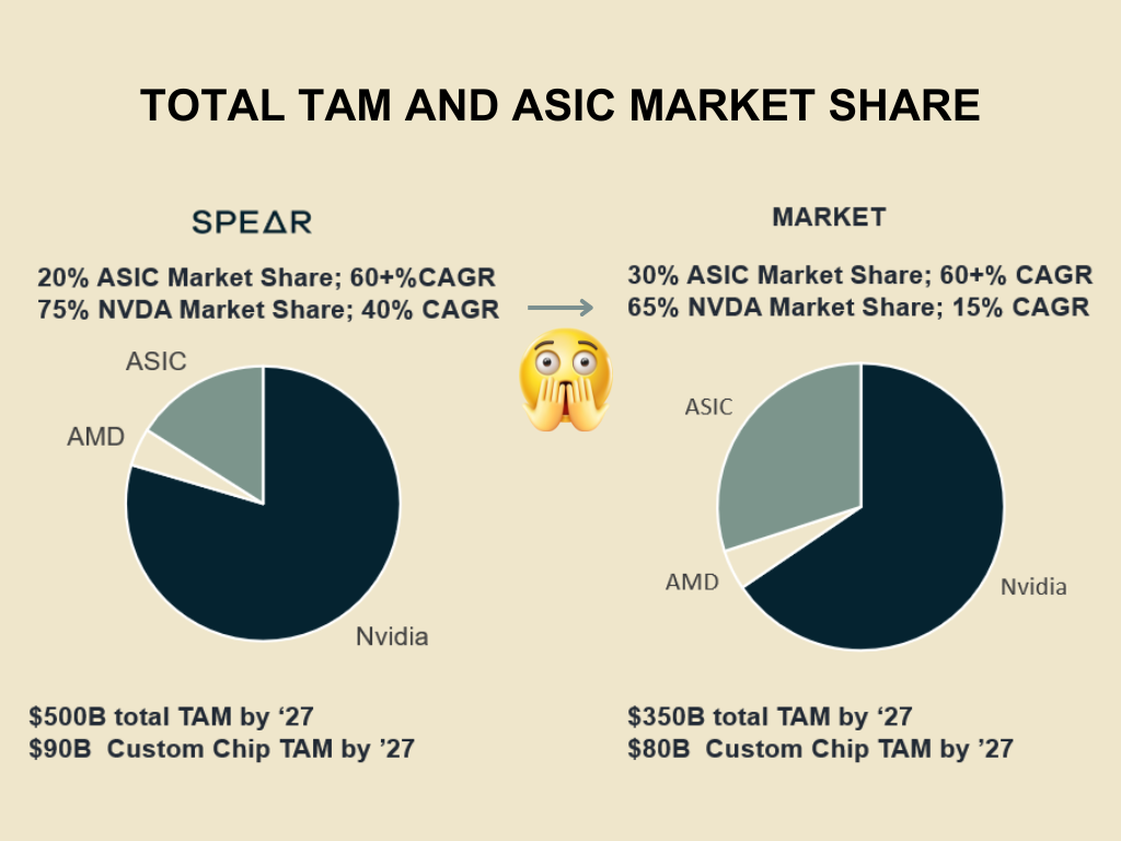 根据两位定制芯片领头羊的评论,我们估计到2027年,定制芯片市场的规模将达到900亿美元,复合年增长率(CAGR)超过60%。