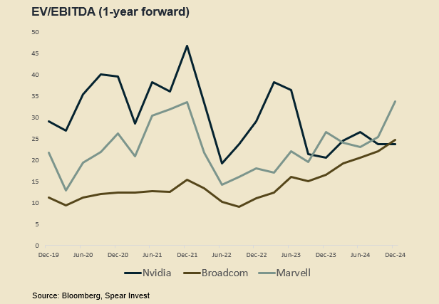 英伟达 (NASDAQ:NVDA)的股价当前在横行整固,甚至按企业价值(EV)/息税折旧及摊销前利润(EBITDA)计算,其估值已低于Marvell和博通。