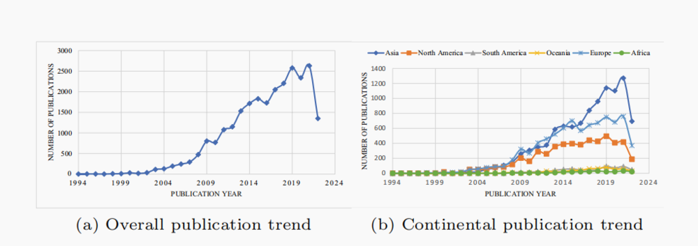 1994-2023年全球(左图)及各洲(右图)的脑机接口相关研究初版趋势,引自大脑信息学杂志