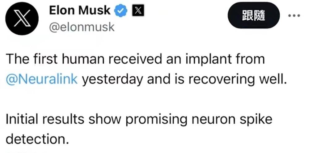 1月29日,埃隆·马斯克在社交平台x上表示,致力于研发侵入式脑机接口(Brain–computer interface ,简称BCI,连接大脑和外部设备之间进行信号交流的媒介)技术的初创公司 Neuralink,在旧金山首次实现了脑机接口芯片在人脑中的植入,初步结果显示,神经元尖峰检测很有前景。