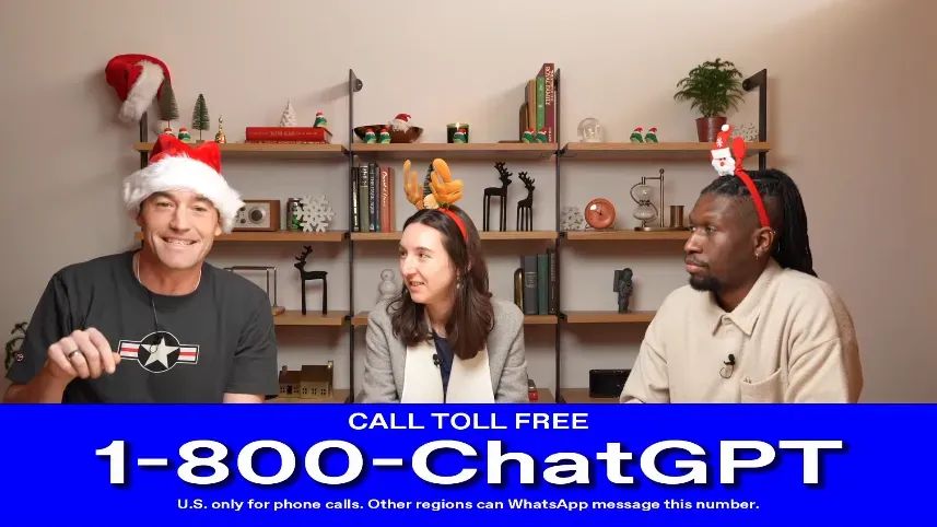 比如第六天,ChatGPT 增加了支持屏幕共享的视频通话和圣诞老人语音模式。前者让用户能与 AI 实时视频通话,分享屏幕或展示周围环境,进行多模态互动,复现了电影《Her》的场景。