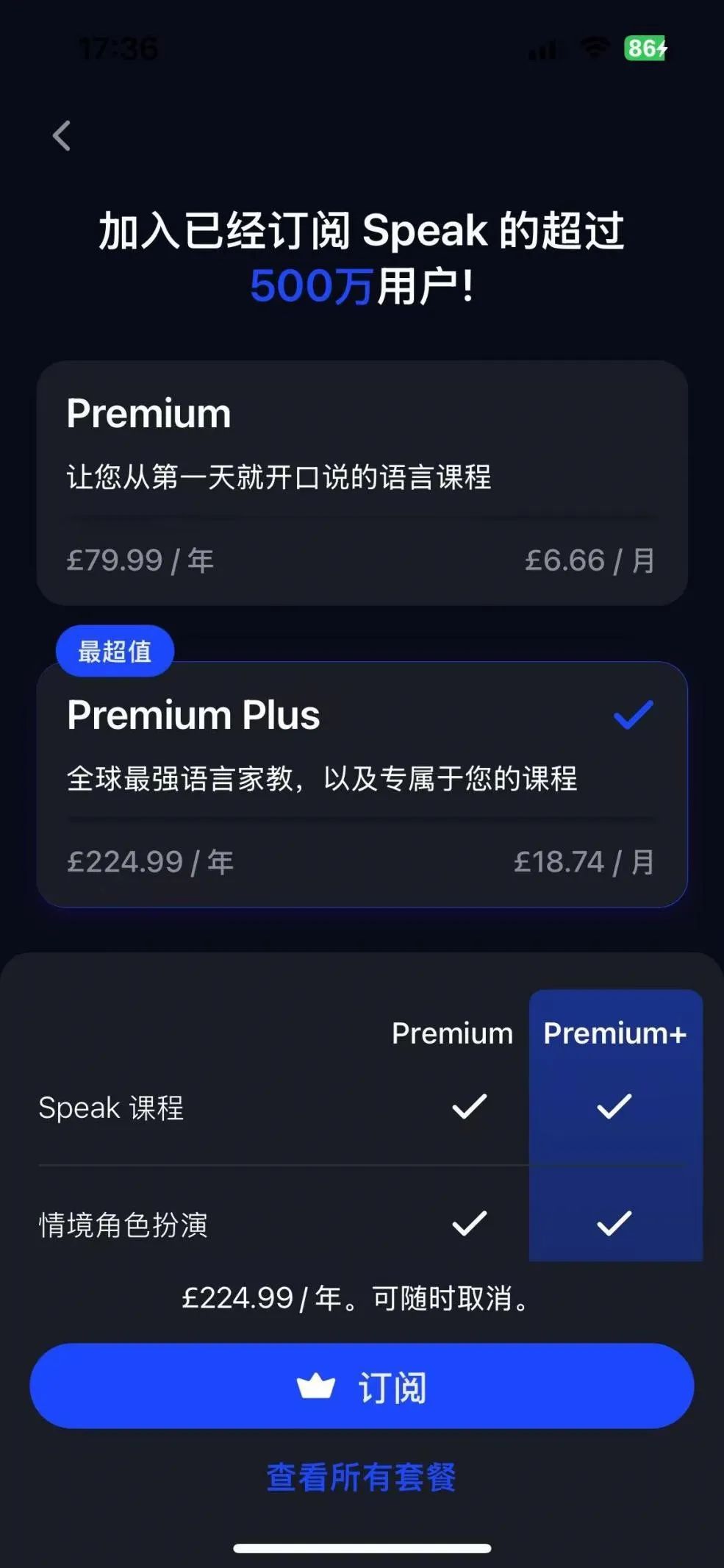 除此之外,在订阅权益方面,Speak 加入了一个价格更高的高级订阅,订阅该权益后,AI 会根据用户的水平定制课程与学习计划,并尽量符合用户的兴趣,在用户完成课程或练习后,AI 还会为用户针对性地纠错。