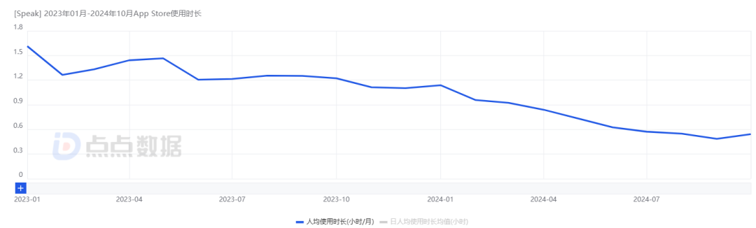 而在数据层面,Speak 的另一大变化就是,近一年以来人均使用时长出现了大幅下降。根据点点数据对 iOS 端用户行为的统计,2024 年 1 月份 Speak 的人均使用时长还能达到 1.14 小时/月,10 月份这个数据降到了 0.54 小时/月,降幅超过 50%。