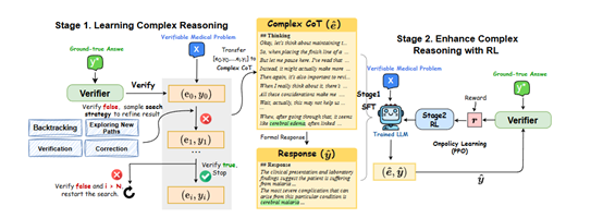 模型会不断重复这个过程,直到找到正确的答案。每次迭代都会生成新的CoT和答案,验证器会继续对新答案进行验证,直到答案被确认为正确为止。通过这种方式,模型能够在不断的尝试和改进中,学习到正确的医学推理方法,提高推理的准确性和可靠性。