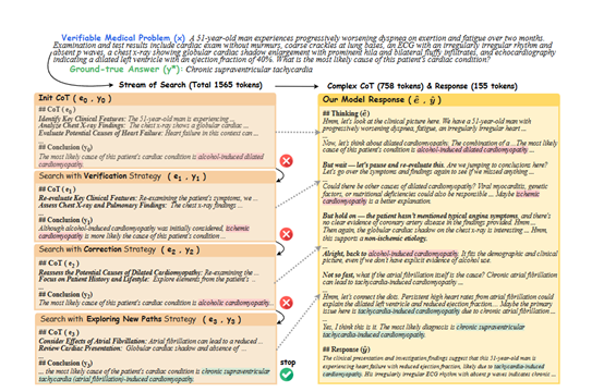 然后,医学验证器会对这个初始答案进行严格验证。如果答案不正确,模型将启动迭代优化过程。它会从预先设定的四种搜索策略(探索新路径、回溯、验证、修正)中随机选择一种,对之前的推理过程进行改进。