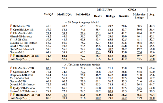 为了评估华佗GPT-o1的性能,在MedQA、MMLU-Pro、MedMCQA、PubMedQA等医学基准中进行了综合测试。结果显示,华佗GPT-o1-70B版本超越了其他所有开源模型,在多个数据集上取得了领先成绩。