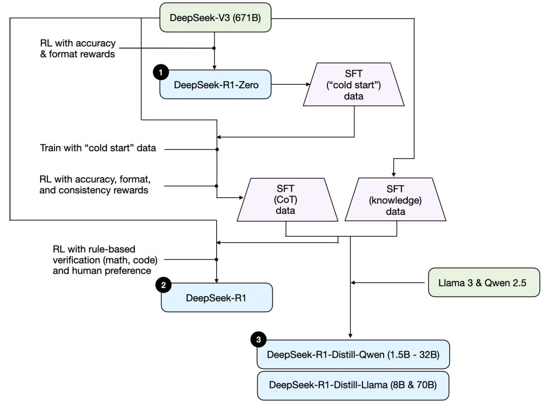 3/ 监督微调(SFT)+ 强化学习(RL),由此产生了DeepSeek的推理模型DeepSeek – R1。