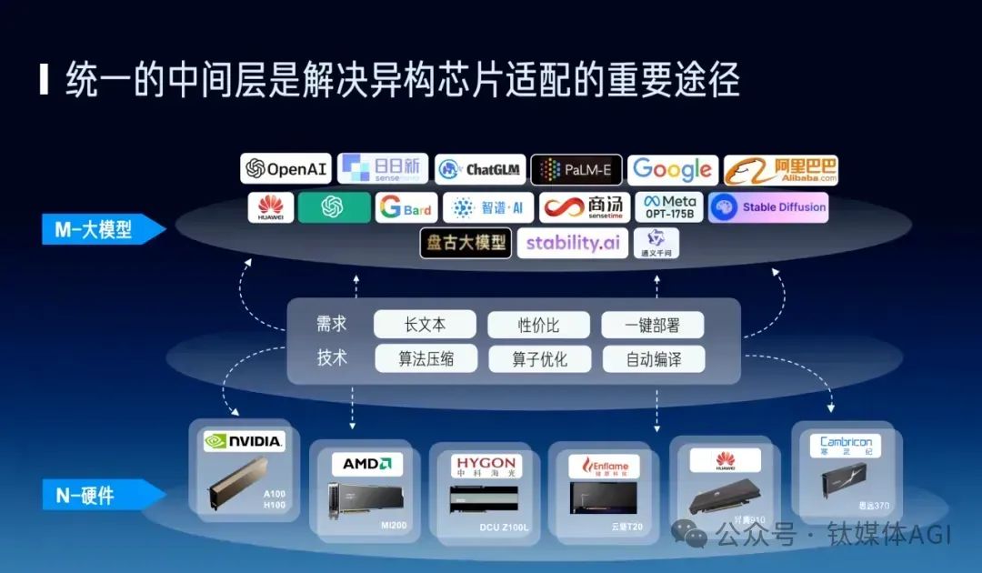简单来说,无问芯穹做的任务属于AI infra技术,M层是大模型,N层是A100/H800等国内外服务器硬件,通过算子优化、自动编译、不同芯片耦合等技术一键部署模型。
