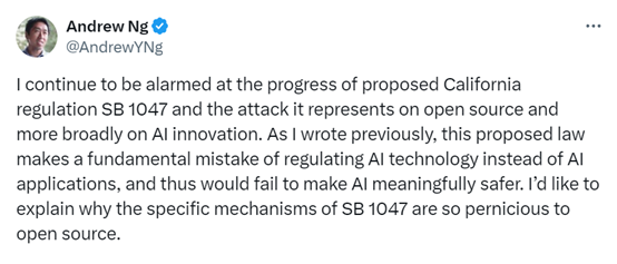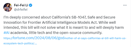 在这个积极否决的过程中,AI界泰斗-吴恩达、图灵奖获得者-Yann LeCun、斯坦福教授-李飞飞等发挥了重要作用。尤其是吴恩达,曾多次在公开场合呼吁科技人士抵制该法案功劳非常大。