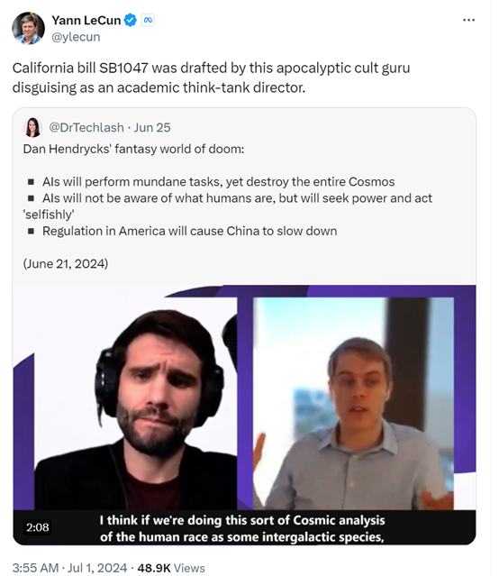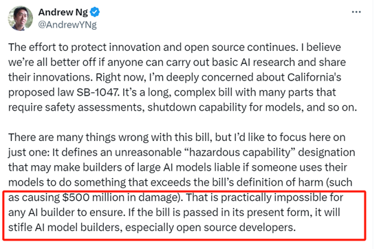 下面是吴恩达、Yann LeCun、李飞飞等指责SB-1047法案的诸多不合理。也可以查看「AIGC开放社区」过去对该法案的多次解读。