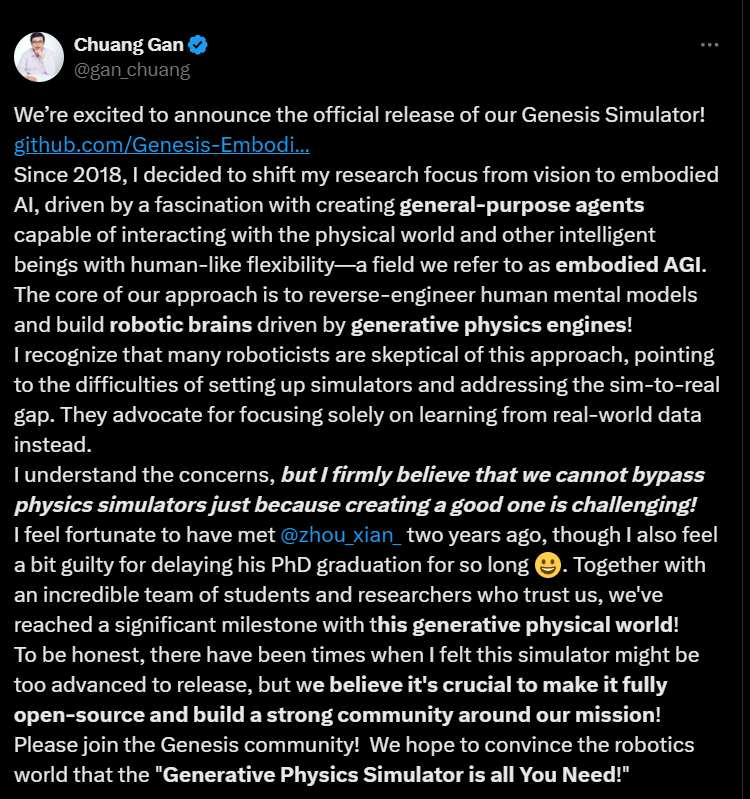 Genesis的团队的Chuang Gan则在X上表示,“我认识到许多机器人学家对此方法持怀疑态度,指出设置模拟器和解决模拟与现实差距的困难。他们主张仅专注于从现实世界数据中学习。我理解这些担忧,但我坚信我们不能仅仅因为创建一个好的物理模拟器具有挑战性就绕过物理模拟器!”他说,“请加入Genesis社区!我们希望说服机器人界‘Generative Physics Simulator is all You Need!’”