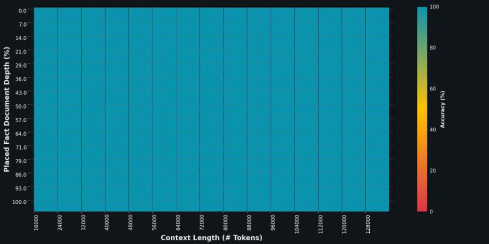 无独有偶,在Needle In A Haystack(NIAH)评估中,Grok-1.5还展现出了强大的信息检索技能,能够在一个包含128K字节的上下文中准确检索到嵌入的文本,并实现了完美的检索结果。