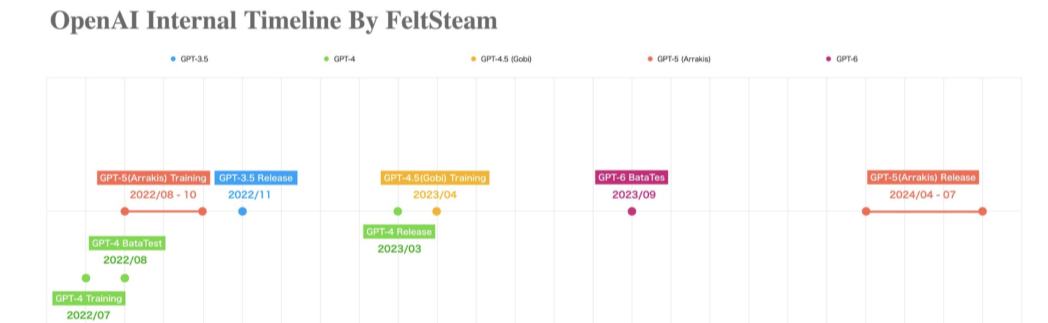 同时,一张名为“OpenAI内部时间线”的图片也在网上疯传,里面清晰地标注出,OpenAI早在2022年8月-10月之间就开始了GPT-5的训练,在2023年4月就已经开始训练了GPT-4.5,而在去年9月就开始了GPT-6的测试。