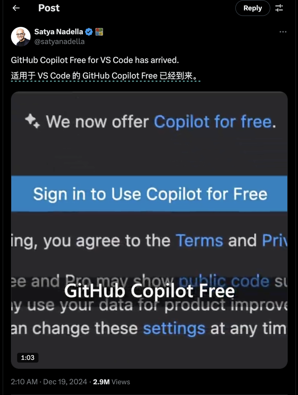 感受到竞争威胁的微软,迅速推出GitHub Copilot免费版。免费用户每月可享2000次代码补全。微软CEO Satya Nadella还亲自发推力挺Copilot。