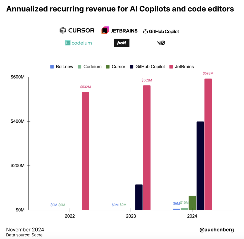 推特用户auchenberg使用研究机构Sacra提供的数据,制作了一张图表,比较了当前市场上主流AI编程产品的年化经常性收入(ARR)。可以看到Cursor的ARR从2023年到2024年猛蹿一大截,但总体量还是没法跟GitHub Copilot相提并论的。