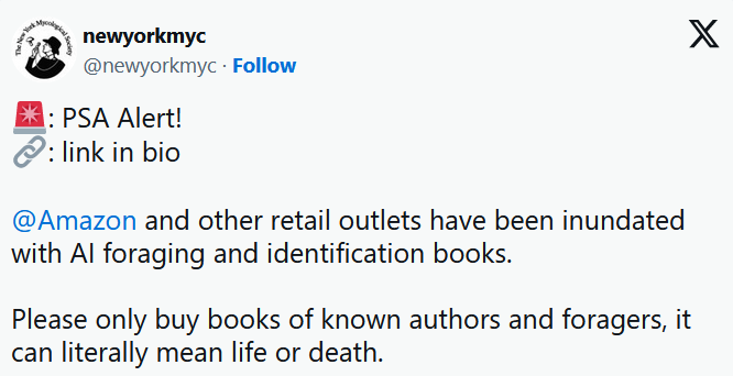 这些书被报道之后,纽约真菌学会都出面发X(前Twitter),呼吁人们“请只购买已知作者和美食家的书籍,这可能关系到生死”。
