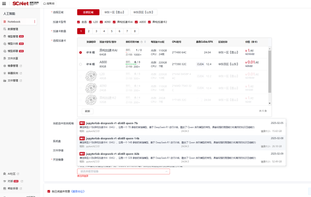 超算互联网此前已经积累了丰富的AI生态与部署经验,平台上已有各类商品超6600款,其中AI模型服务商品近240款,既有DeepSeek、Qwen等国内开源模型,也有Llama、Stable Diffusion、Gemma等国外AI开源模型。丰富的模型矩阵与轻量化工具,让超算互联网成为更高效的AI平台。平台还开放了AI社区,可供开发者们进行开发调试和知识共享。