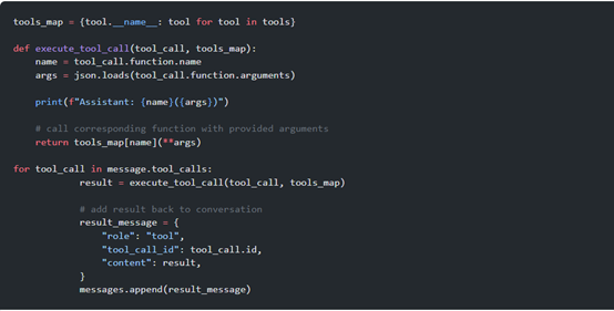最后,当大模型调用一个工具时,我们需要执行相应的函数并将结果返回给模型。可以通过将工具名称映射到Python函数的tool_map来实现这一点,然后在execute_tool_call中查找并调用,再将结果添加到对话中。