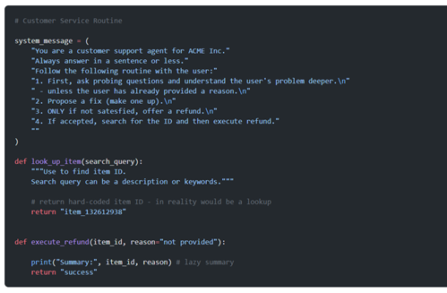 先定义两个函数execute_refund和look_up_item。我们可以把它称为客户服务常规操作、智能体、助手等。