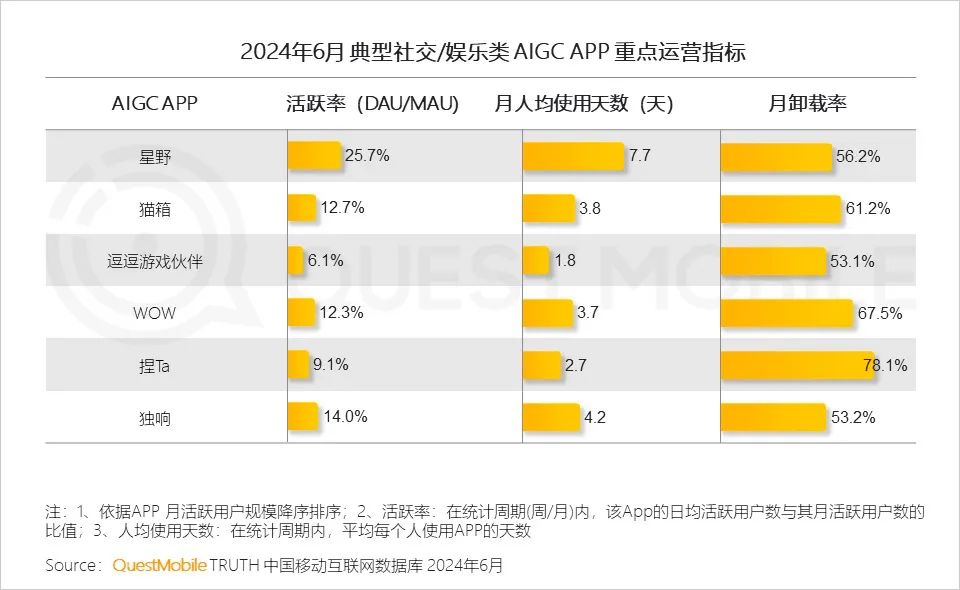 QuestMobile的《2024上半年AIGC APP流量与场景研究报告》显示,在一众AI APP中,AI社交/娱乐类 APP的流量排名并不靠前,但是普遍复合增长率表现良好,大多位于TOP10。而且相较于工具类AI APP,AI社交/娱乐类 APP活跃率和月人均使用天数表现突出,其中星野的月人均使用天数达7.7天,活跃率为25.7%。