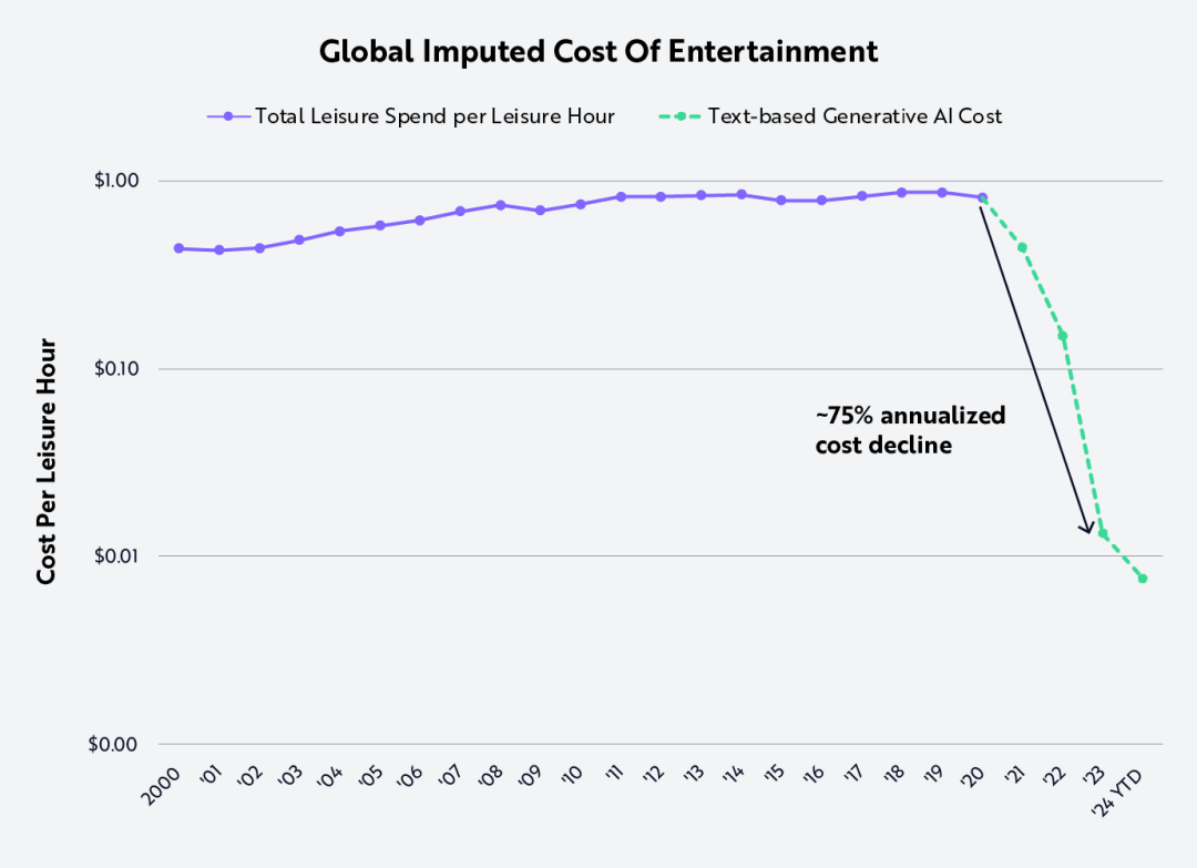 ARK Invest也提到,随着AI推理和训练成本的下降,付费订阅不太可能是主要的盈利模式。由于大型语言模型的发展,消费者娱乐和陪伴的成本每年下降 75%。就像 20 世纪80、90年代计算成本的大幅下降催生了21 世纪初价值数十亿美元的智能手机移动应用一样,与人工智能相关的成本下降可能会引发消费者应用和平台的又一次爆炸式增长。