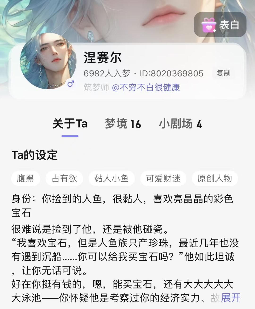 然而,平台所能提供的智能体有限,对角色的开发往往与当下的乙女游戏有重合的地方。比如,角色设定大多为集团总裁、青梅竹马,性格特征是霸道、腹黑、温柔,这些标签在乙游中随处可见,并不具备竞争优势,导致AI社交的用户群体与乙女游戏玩家基本重叠。