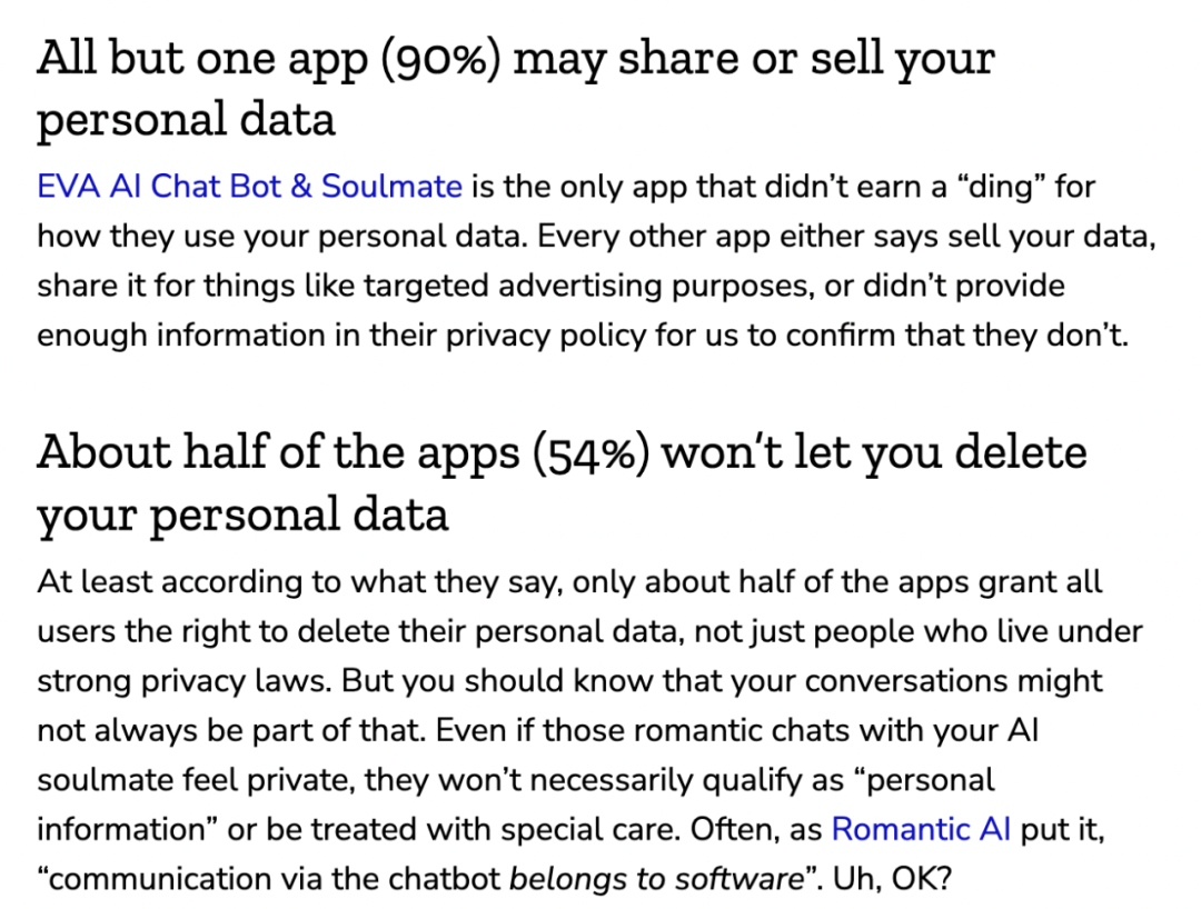 与此同时,平台想要更精准地让内容触动到用户,就需要让大模型汲取更多的用户数据,但如何保证用户隐私安全问题,让事情变得矛盾起来,因此目前许多平台只能忽略后者。Mozilla在测评了11款AI社交软件后发现,90%的公司不能充分保护用户的个人数据安全,54%的应用程序不允许用户删除个人数据。