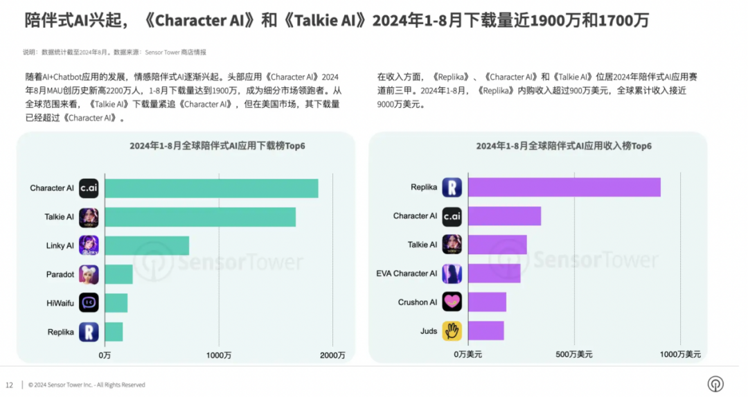 Replika和Character AI成为最早以及最成功的AI陪伴赛道头部应用,目前占据大部分市场份额。2024年1-8月全球陪伴式AI应用下载榜和收入榜中,两个应用分列第一。