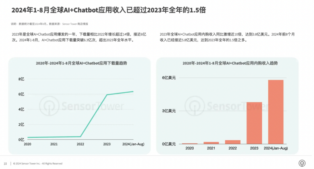 随着Open AI推出ChatGPT,AI+Chatbot(人工智能驱动的聊天机器人)几乎渗入到了所有领域的创业项目之中。Sensor Tower报告提到,2024年1-8月,AI+Chatbot应用下载量突破6.3亿次,超出2023年全年水平,前8个月,全球AI+Chatbot应用内购收入接近5.8亿美元,已经超过2023年全年的1.5倍之多。