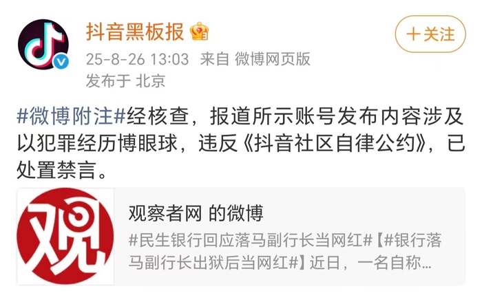 8月26日下午,抖音黑板报发文称,经核查,报道所示账号发布内容涉及以犯罪经历博眼球,违反《抖音社区自律公约》,已处置禁言。