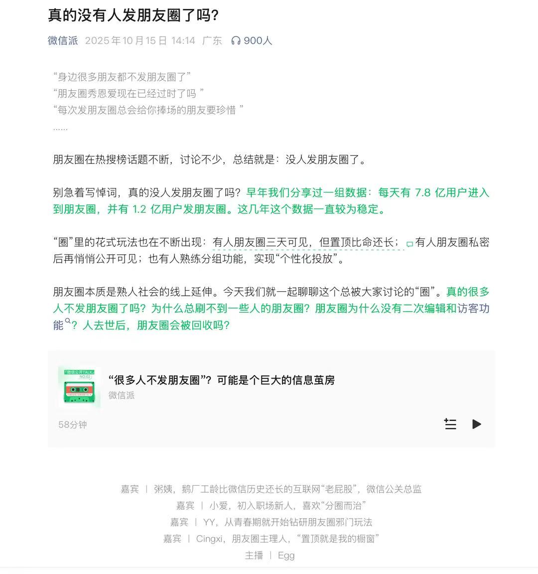 针对很多朋友圈在热搜榜的话题,比如真的没人发朋友圈了?微信派表示,早年微信分享过一组数据:每天有 7.8 亿用户进入到朋友圈,并有 1.2 亿用户发朋友圈。这几年这个数据一直较为稳定。