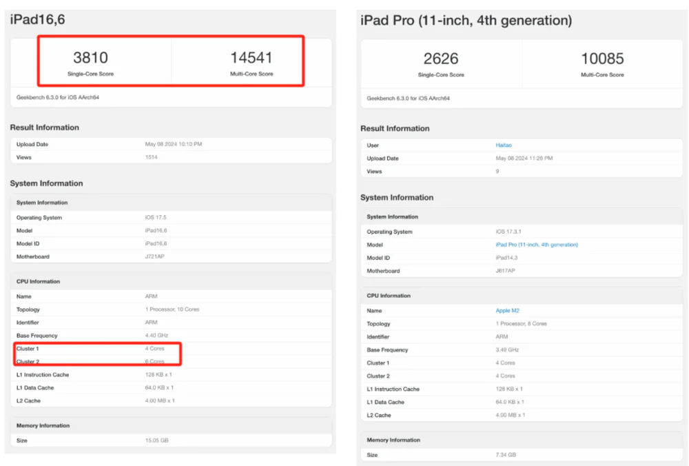 苹果官方表示,M4的CPU(10核)比上一代iPad Pro搭载的M2快了1.5倍。有网友晒出M4的iPad和M2的iPad的geekbench跑分,基本也就是1.5倍。