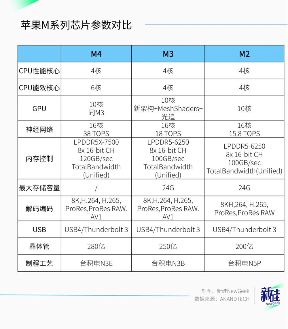 从参数上来看,M4芯片采用了台积电第二代3nm制程工艺(N3E),并配备当前AIPC主流的CPU+GPU+NPU组合。