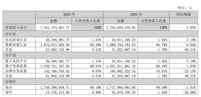 该公司的主营业务从产品角度分为数字效果流量、品牌内容流量、数字竞技平台和其他,其中占比最大的为数字效果流量业务。2022年和2023年,数字效果流量业务在公司总营收的占比均超过86%。