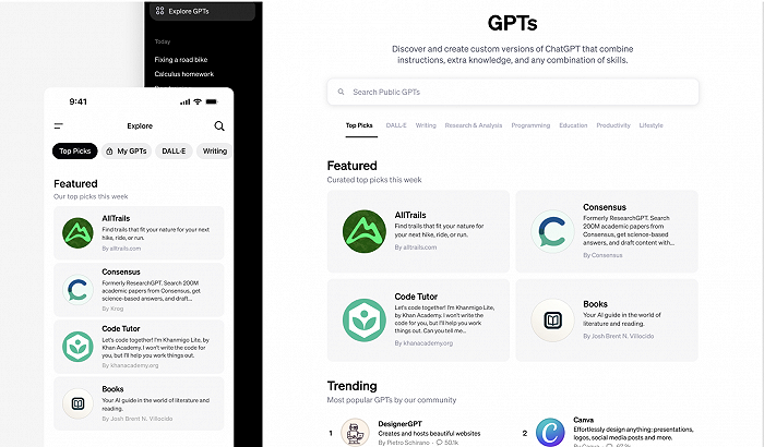 GPT Store的页面看上去和苹果的App Store类似,在商店页面的排行榜上能看到“特色”和“趋势”等分类,用户既能找到最受欢迎的聊天产品,也能根据自己需要自行搜索特定的GPT类型。
