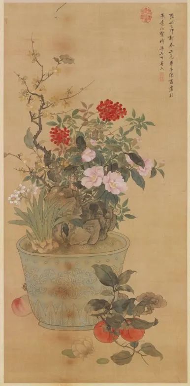 清代,陈书,《岁朝丽景》,轴,绢本设色,96.8X47厘米,台北故宫博物院藏。