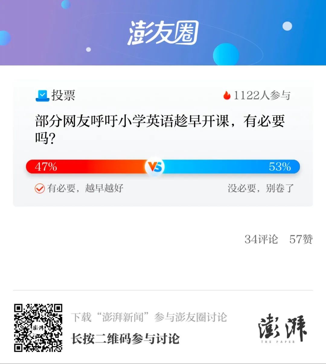 小学英语尽早开课,有必要吗?你觉得学英语,应该什么时候开始?澎湃新闻·澎友圈发布投票进行讨论,1122位网友中,47%认为“有必要,越早越好”,53%则表示没这个必要。