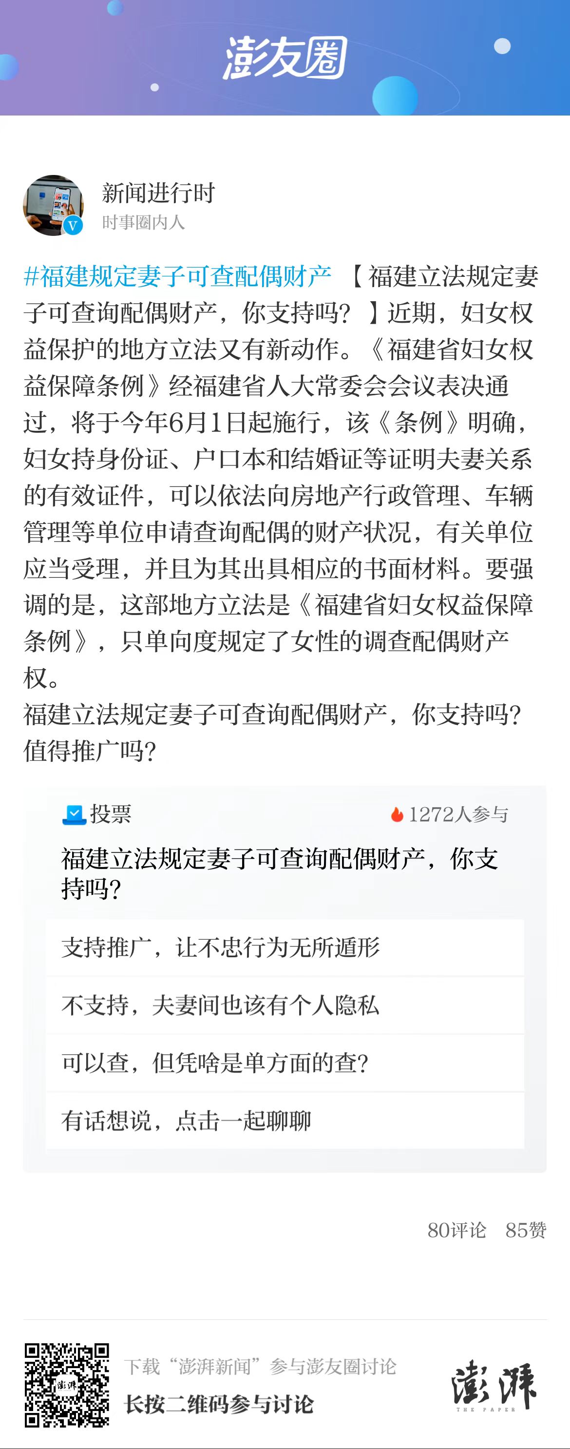 近期,《福建省妇女权益保障条例》经福建省人大常委会会议表决通过,将于2024年6月1日起施行。该条例明确规定,妇女持身份证、户口本和结婚证等证明夫妻关系的有效证件,可以依法向房地产行政管理、车辆管理等单位申请查询配偶的财产状况,有关单位应当受理,并且为其出具相应的书面材料。福建立法规定妻子可查询配偶财产,值得推广吗?澎友圈的网友们发表了他们的见解。