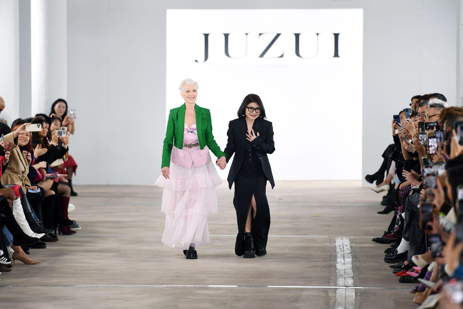 谢幕模特、特斯拉首席执行官埃隆·马斯克的母亲梅耶·马斯克(中左)和中国设计师王陶(中右)11日在玖姿品牌时装秀后向观众致意。