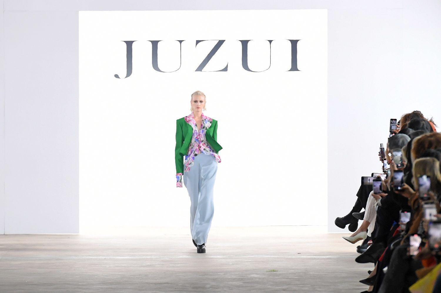 模特在台上展示玖姿品牌时装。