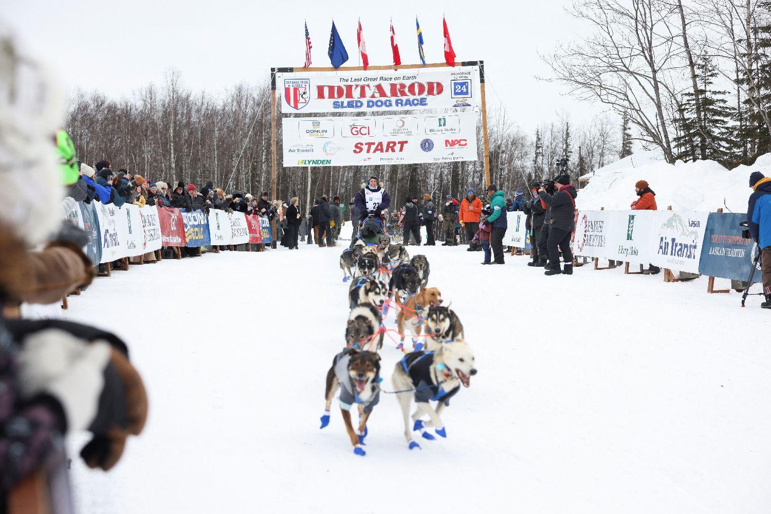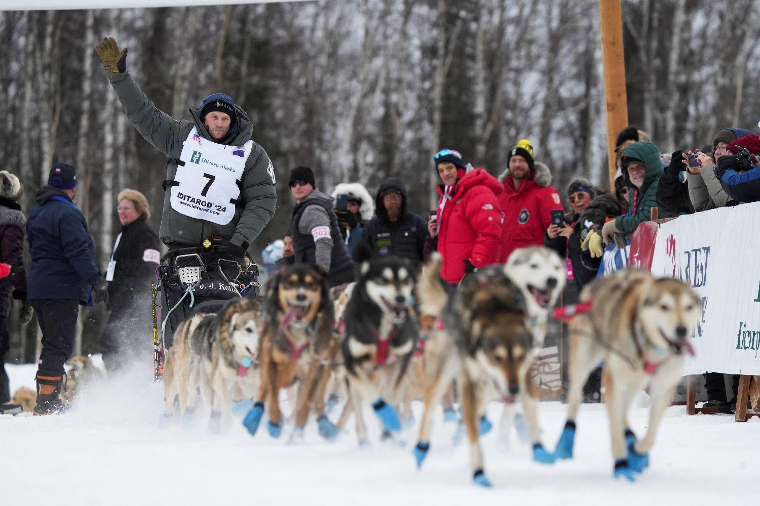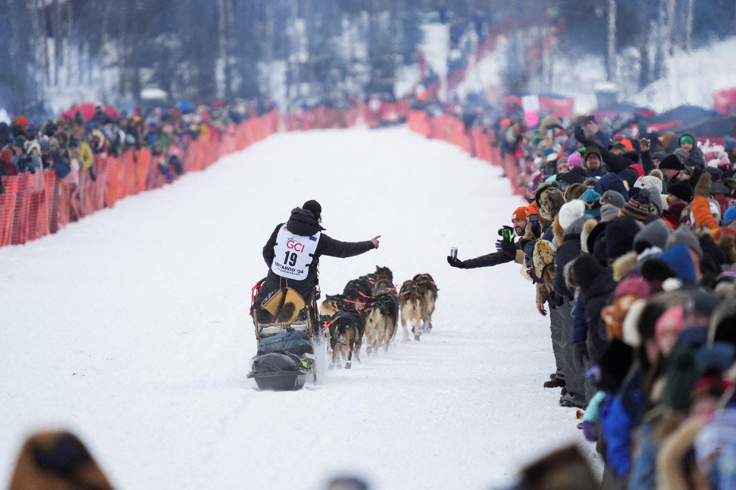 该赛事起源于1925年冬天,当时诺姆流行一种急性传染病。一批白喉血清用火车从安克雷奇运到尼纳纳,然后用狗拉雪橇接力的方式,跑了1125公里,将这批血清运到了诺姆,挽救了许多人的生命。图为选手杰森·麦基的雪橇队出发后和人群挥手致意。