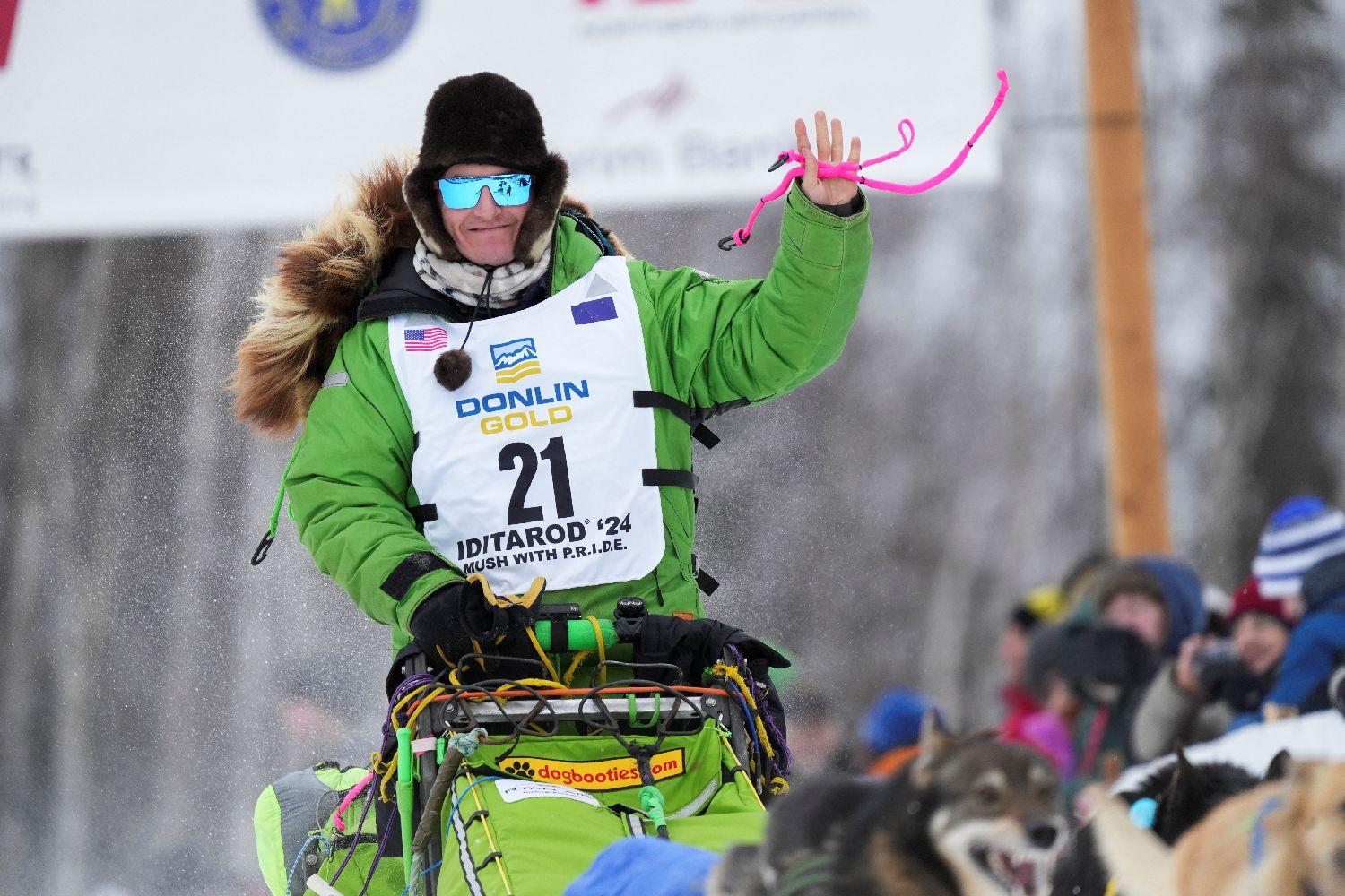 今年最受瞩目的是2023年的冠军瑞安·雷丁顿(Ryan Redington),他在前三年也获得了前十名的好成绩。图为选手瑞安·雷丁顿出发后向观众挥手。