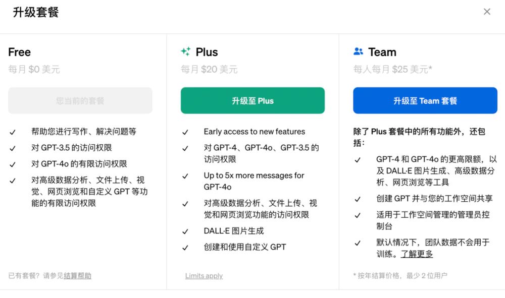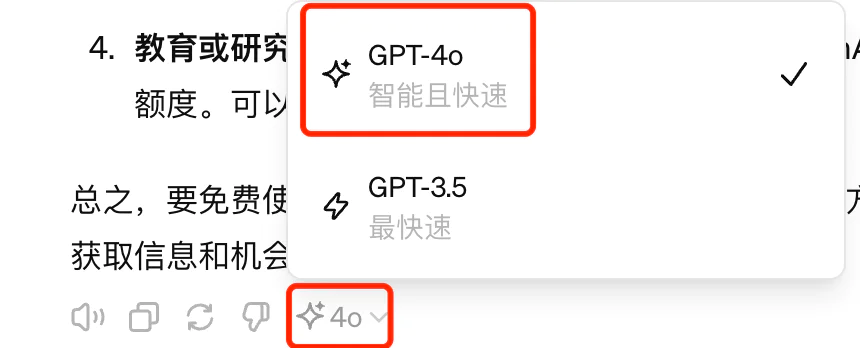 值得注意的是,免费用户每天使用GPT-4o的次数有限,超出限制后要么升级为付费用户,要么只能用GPT-3.5。