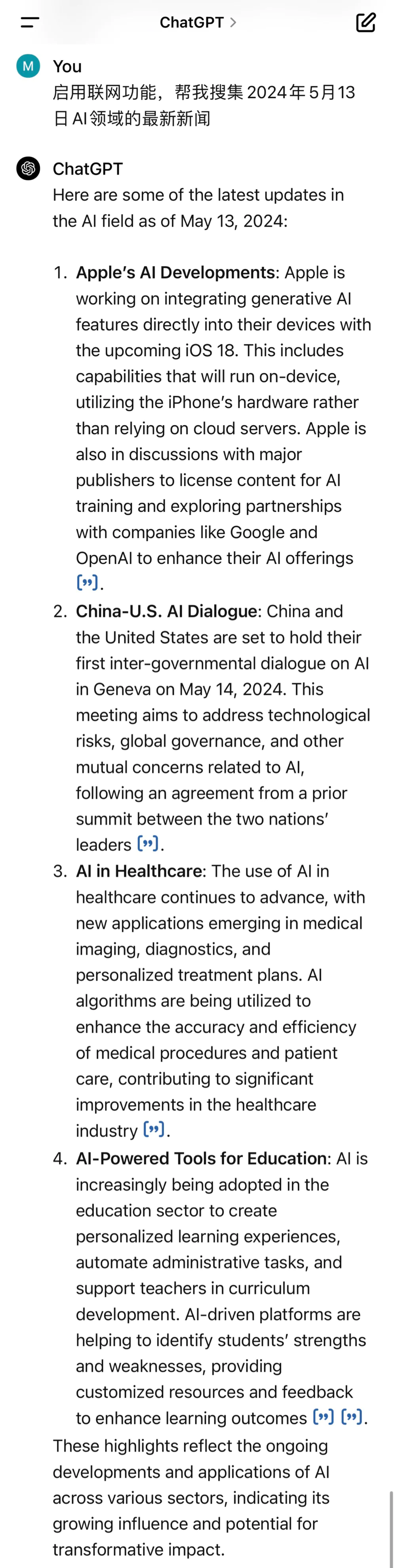 我们让它搜集2024年5月13日AI领域的新闻,它不仅对新闻进行了概括整理,还附上链接。
