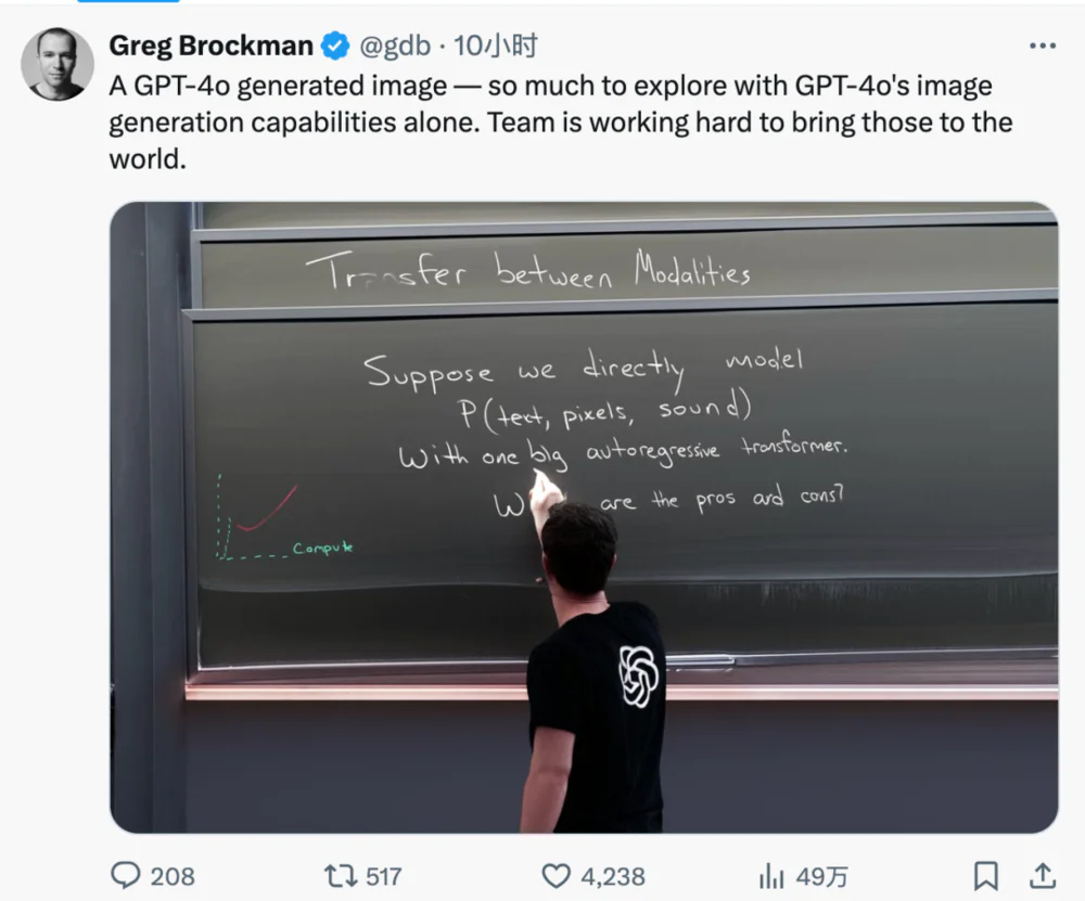 更离谱的是,GPT-4o还能生成板书图片,图中的板书简直跟人类写的没啥差别。要知道,对于大模型来说,“写字”可是一大难题。