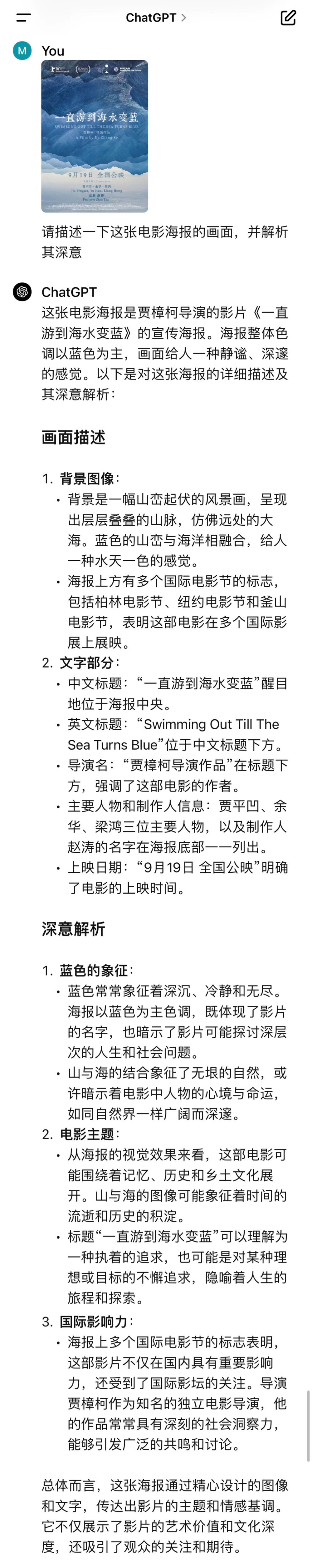 我们就把这张海报“喂”给GPT-4o,还真别说,它回答的有板有眼,其中的深意均被get到。