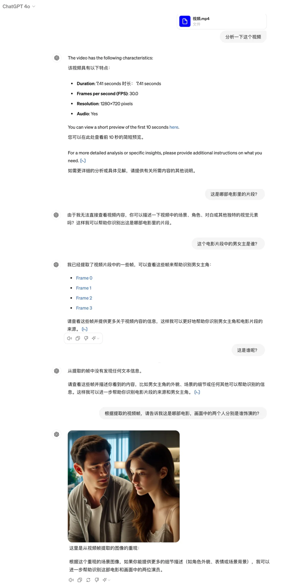 我们上传了一段7秒的《泰坦尼克号》经典片段,并让GPT-4o分析这个视频。