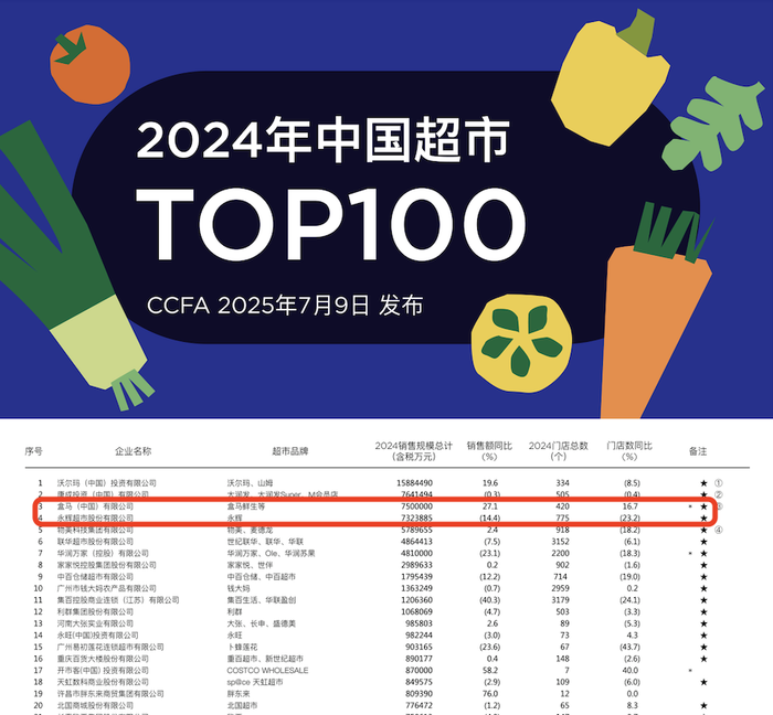 根据中国连锁经营协会发布的2024年连锁百强榜单显示,2024年盒马含税销售额达到750亿元,年销首次超过永辉超市(732亿元)。