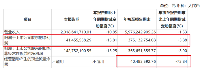 可以发现,相比营收,公司的利润下滑幅度明显更大。2024年前三季度,公司实现归母净利润3.75亿元,同比下滑3.88%。其中,第三季度归母净利润1.41亿元,同比减少15.81%。